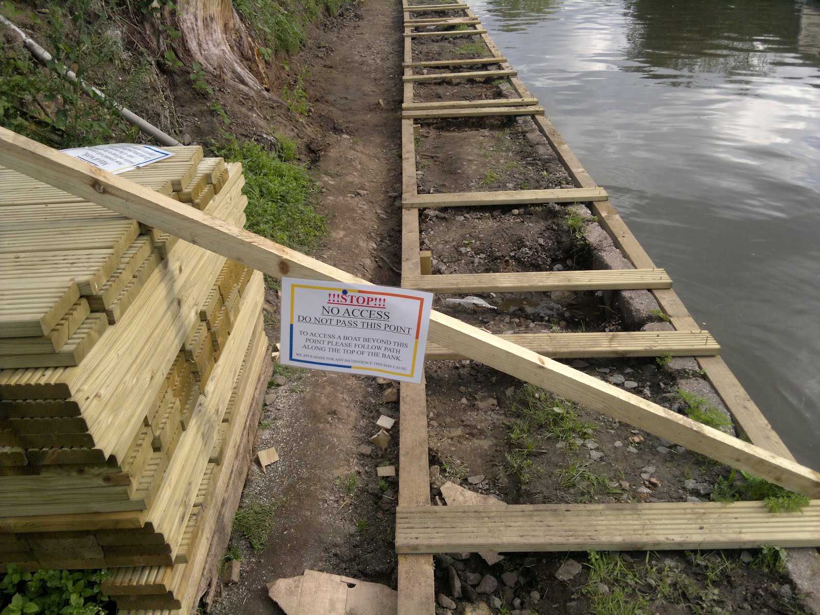 The work comprised of: Widening the existing path to allow room for the machinery to be moved along the length of the moorings. Then we dug out behind the original concrete piles that line the bank, straightening them up and tying them back. We then replaced the wooden wailing infront of the piles and installed a one metre wide deck which extends the length of the moorings. This has inturn been supported at the back edge by large timbers which are spiked into the ground and concreted in. The mooring rings have been attached to four foot long steel pins that have been driven into the ground, concreted in and bolted to the back of the decking. This forms one large and strong structure. We are now nearing the completion of the one metre path that runs along the back edge of the decking. Three additional water points have been installed which serve the first eight boats (or further if you have a long hosepipe!) and the pressure has been increased! (Lorraine reports that it used to take her husband three hours to fill her water tank and it now only takes twenty minutes, a vast improvement). We are still to move the existing electric point and to install a second which will also serve the first eight boats. These electric points are metred and work on a prepayment system.